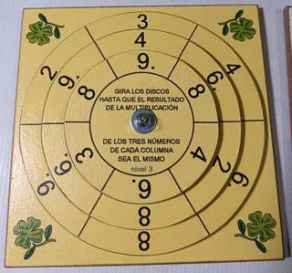 Juego educativo para practicar multiplicaciones. - Ruedas de madera con números. - Gira los discos hasta que el resultado de la multiplicación de los tres números de cada columna sea el mismo, en este caso, Nivel 3, 144. También hago Nivel 1 y Nivel 2