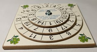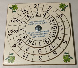 Juego educativo de madera con tres discos giratorios para practicar sumas. Ideal para el aprendizaje. Rotando los discos, hay que conseguir que todas las columnas de 3 números sumen 26 - Fabricado en madera de forma artesanal. Elaboración propia. - Diseño con números y tréboles decorativos.