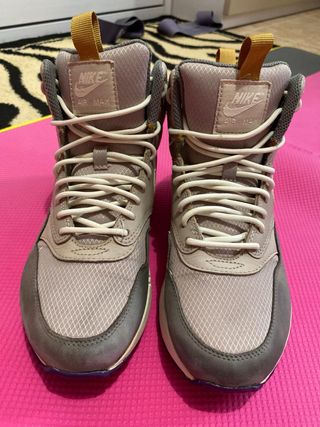 Zapatillas Nike Air Max tipo bota en muy buen estado. Color beige/rosa con suela morada y detalles en mostaza. Muy cómodas y con buena amortiguación Air Max. Perfectas para invierno, caminar o look urbano. Talla 38 (24 cm). ✔️ Suela en muy buen estado ✔️ Interior limpio ✔️ Muy poco uso Las vendo porque ya no las utilizo. Se pueden ver sin compromiso.