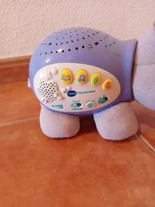 Proyector de Vtech con forma de hipopótamo. - Proyecta estrellas en el techo. - Incluye melodías y sonidos relajantes. - Diseño suave y tierno para acompañar al bebé.