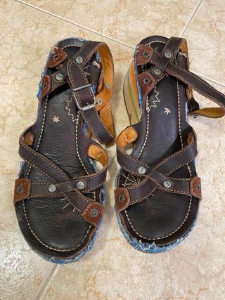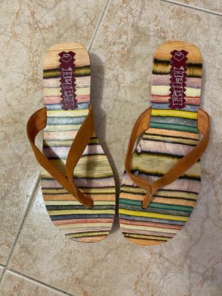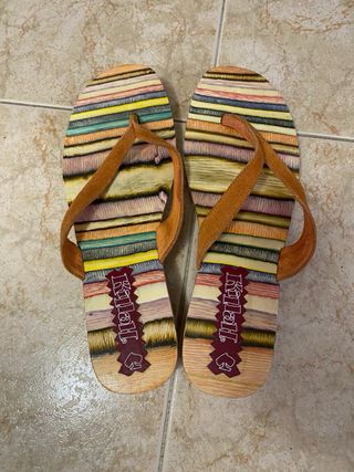 Sandalias Killah originales con diseño multicolor muy original y veraniego. Tienen tiras de ante marrón y una suela con efecto madera de colores que las hace muy llamativas. Talla 37. Están usadas pero en buen estado, con desgaste normal en la suela por el uso, como se ve en las fotos. Siguen siendo cómodas y perfectas para verano. ✔ Marca: Killah ✔ Talla: 37 ✔ Color: multicolor con tiras marrón ✔ Estilo veraniego / casual Ideales para looks de verano, vacaciones o diario. Entrega en mano o envío por Wallapop.