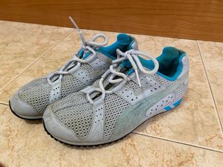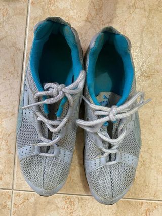 Zapatillas deportivas Puma originales en color gris claro con detalles en azul turquesa. Son ligeras, transpirables y muy cómodas gracias al tejido de malla. Talla: 37 Están usadas pero en buen estado, con desgaste normal por el uso. La suela está bien y aún tienen mucha vida para caminar, hacer deporte o uso diario. ✔ Marca: Puma ✔ Talla: 37 ✔ Color: gris con azul ✔ Tejido transpirable ✔ Muy ligeras y cómodas Ideales para caminar, gimnasio, viajes o para el día a día. Entrega en mano o envío por Wallapop.