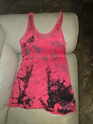 Camiseta sin mangas para mujer con un diseño llamativo y detalles metálicos. - Cuello redondo adornado con tachuelas plateadas. - Estampado abstracto en negro y gris sobre fondo rojo. - Tejido ligero y cómodo.