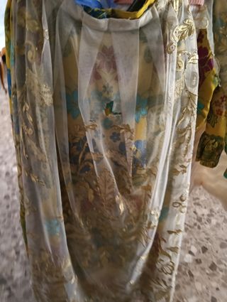 Conjunto de traje de fallera con manteletas. Corpiño: Mangas: Largo de 35 a 40 cm son asimetrícas Cuerpo: Largo, 40m de escote a pico. Pecho 78cm Falda: Largo, 96cm Cintura: 77cm Todo aprox - Diseño con estampado floral. - Manteletas de encaje. - Talla M (38).