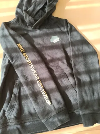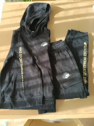 Conjunto de chándal Nike en color negro, talla L para niño. Incluye sudadera con capucha y pantalón. - Sudadera con bolsillo tipo canguro. - Pantalón con bolsillos laterales cargo y uno trasero. - Estampado NIKE SPORTSWEAR EST. 1972 en dorado en ambas prendas. Talla L niño.