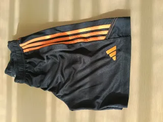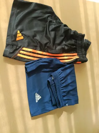 Conjunto de dos pantalones cortos de deporte para niño de la marca Adidas. - Talla 13-14 años. - Uno de ellos es negro con detalles naranjas y con cremallera en los bolsillos. - El otro es azul marino.