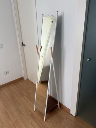 Elegante espejo de pie con un diseño moderno. - Marco blanco. - Detalles en madera. - Base estable.