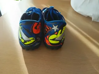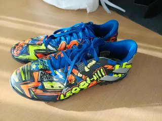 Zapatillas de fútbol sala Adidas Messi. - Talla 38. - Diseño vibrante con temática de Barcelona y Messi. - Cierre con cordones.