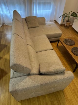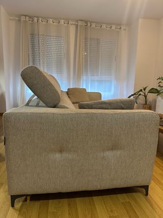 Sofá chaiselongue eléctrico modelo Dino de Pedro Ortiz. Un mueble cómodo y elegante para tu salón. ***Recogerlo en Febrero*** - Tapicería de tela. - Color beige. Estructura: Madera de pino con tablero de partículas • Suspensión asiento: Bastidor metálico muelles ZZ • Mecanismo: Relax eléctrico, fi jo o des- lizante (35 cm.), cabezal motorizado o manual • Asientos: Espuma poliuretano 35 y 40 kg suave • Cabezal y riñonera: Espuma poliuretano super suave Patas metálicas negras Dos cojines a juego Motor relax
