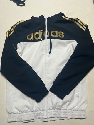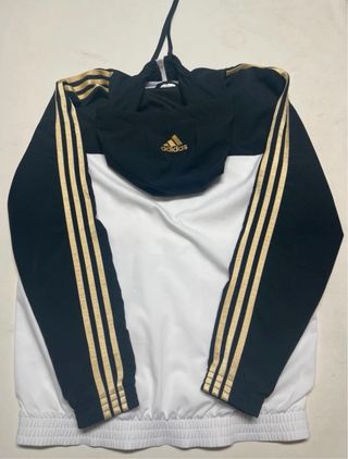 Chaqueta deportiva Adidas con cremallera, en negro y blanco con detalles dorados. Diseño moderno y elegante, muy cómoda e ideal para uso diario tanto en deporte como fuera de él. ✅Logo frontal ✅Cremallera completa ✅Puños у cintura elásticos ✅Muy buen estado ✅Casual Perfecta para entretiempo o completar un estilo streetwear 📦Envío rápido y cuidado 💬Si tienes dudas, iescríbeme sin compromiso!
