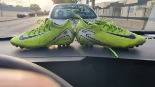 Botas de fútbol Nike en color verde y plateado. - Talla 35. - Diseño deportivo.