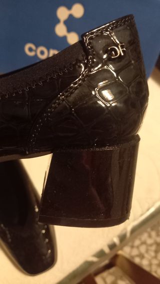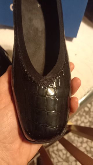 Zapatos planos de la marca Comfeet en color negro y talla 38. Tienen un diseño elegante con textura de cocodrilo. - Material exterior brillante. - Detalle elástico en el borde.