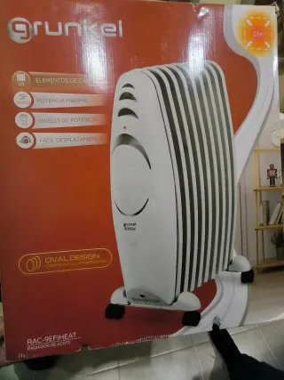 Radiador de aceite Grunkel con diseño ovalado y 9 elementos calefactores. - Potencia máxima de 2000W. - 3 niveles de potencia ajustables. - Fácil desplazamiento gracias a sus ruedas. - Cubre hasta 23m².