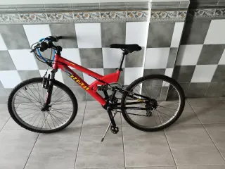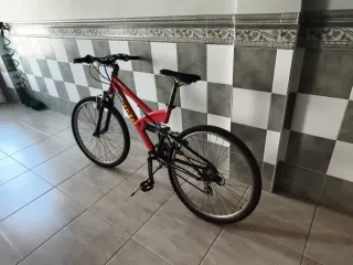 Bicicleta de montaña con suspensión delantera y trasera. - Cuadro de color rojo. - Ruedas de 26 pulgadas. - Frenos de disco.