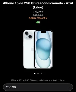 PRECIO NEGOCIABLE iPhone 15 en color azul y con 256 GB de almacenamiento. -Modelo: iPhone 15 - Capacidad: 256 GB - Color: Azul - Estado: Reacondicionado -Bateria: 100%