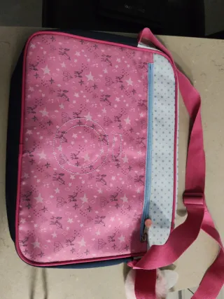 Práctico portatodo de la marca Ensō con un divertido diseño. - Estampado de unicornios y estrellas. - Incluye un llavero con pompón rosa y cuerno de unicornio. - Capacidad para ordenador portátil. - Bolsillo trasero con cremallera. - Dos bolsillos frontales con cremallera. - Correa ajustable para llevar al hombro.