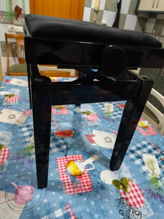 Banqueta de piano ajustable en altura con asiento acolchado de cuero negro y estructura de madera lacada. Está , prácticamente sin uso, muy estable y cómoda para tocar. El mecanismo interior metálico permite regular la altura fácilmente mediante los pomos laterales. Altura regulable Asiento acolchado de cuero muy cómodo Estructura sólida y estable Acabado elegante tipo piano Ideal para piano acústico o digital