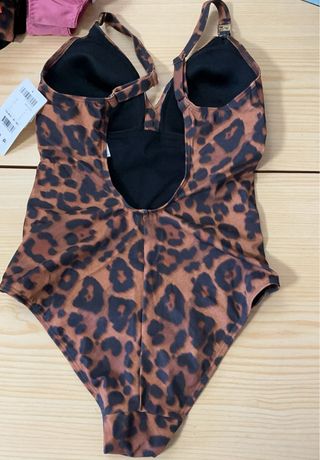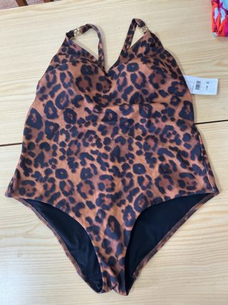 Traje de baño con un llamativo estampado de leopardo. - Diseño con tirantes. - Detalle metálico en los tirantes. - Escote pronunciado.