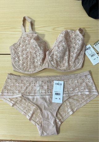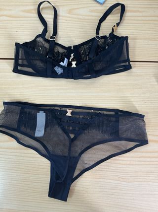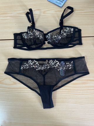 Conjunto de lencería de la marca Chantelle, a estrenar. - Diseño con encaje floral. - Tirantes ajustables. - Incluye sujetador y braguita. - Detalles metálicos dorados.