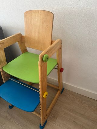 Silla evolutiva de madera para niños, ideal para acompañar su crecimiento. Su diseño permite ajustar la altura para adaptarse a diferentes etapas. - Fabricada en madera natural. - Asiento y reposapiés de colores (verde y azul). - Estructura robusta y segura.