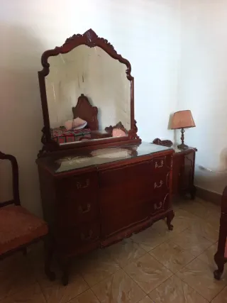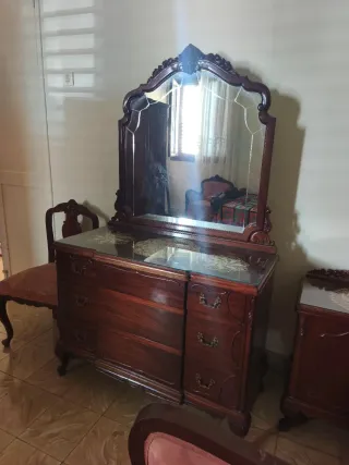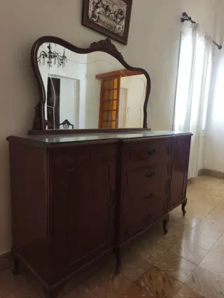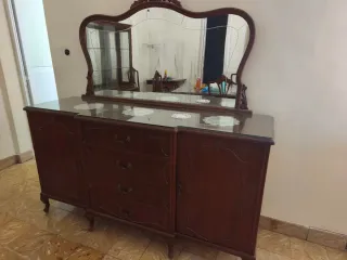 Elegante aparador de estilo clásico con un gran espejo. - Mueble de madera oscura. - Encimera de cristal. - Diseño con detalles ornamentales. - Cajones con tiradores antiguos. - Espejo un poco deteriorado