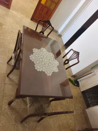 Conjunto de mesa de comedor de madera con un diseño clásico y elegante. Incluye seis sillas a juego. - Mesa con superficie de cristal. - Sillas tapizadas con estampado floral. - Patas de madera tallada. 6 sillas solas --> 400 euros Mesa sola --> 300 euros Precio en conjunto --> 540 euros 102cm de ancho y 158cm de ancho apx