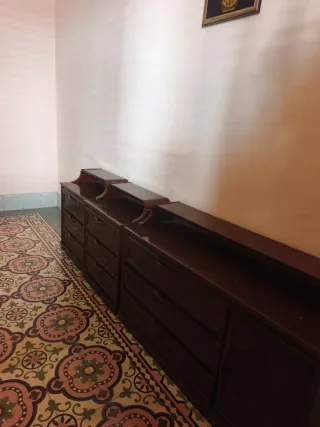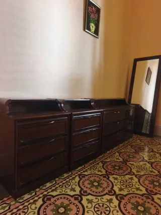 Conjunto de muebles de madera oscura, ideal para dormitorio. - Incluye dos mesas de noche y una cajonera. - Diseño clásico con tiradores integrados. - Acabado en madera oscura. - Material muy bueno