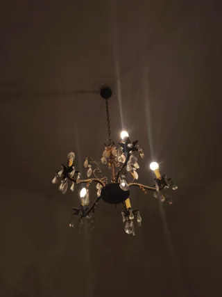 Elegante lámpara de araña antigua con detalles de cristal. - Estructura metálica con acabado envejecido. - Cristales colgantes decorativos. - Diseño clásico de época. Precio en conjunto: 250 euros Precio por unidad: 150 euros
