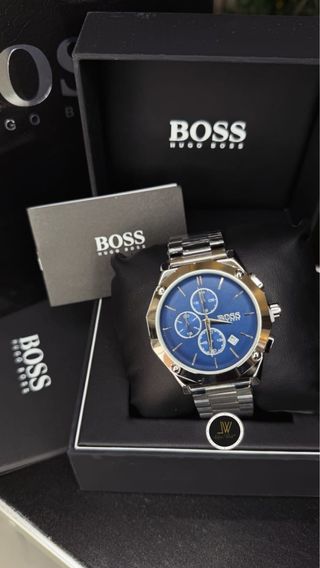 Elegante reloj de la marca Boss, sin estrenar. Un accesorio moderno y sofisticado. - Esfera de color azul. - Correa y detalles en plateado.
