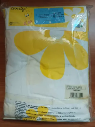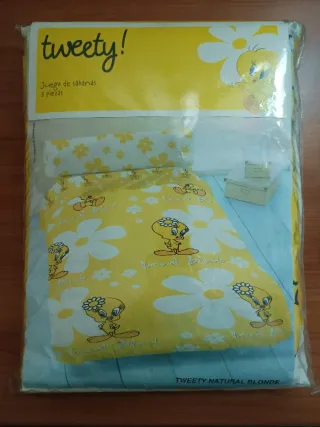 Juego de sábanas infantiles con diseño de Piolín. - Incluye 3 piezas. - Estampado de flores y Piolín. - Color amarillo. - Marca: Tweety Natural Blonde.