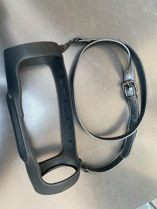Altavoz portátil JBL con correa negra. - Altavoz de color gris con detalles en negro. - Correa ajustable de cuero sintético negro.