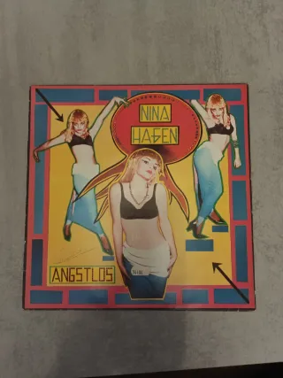 Disco de vinilo de Nina Hagen, Angstlos. - Portada con diseño llamativo. - Incluye la imagen de Nina Hagen en varias poses. - Título del álbum Angstlos destacado.