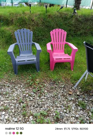 Conjunto de dos sillas de jardín, una gris y otra rosa, perfectas para tu terraza o balcón. - Fabricadas en plástico resistente. - Diseño moderno y cómodo.