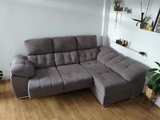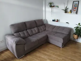 Sofá moderno con chaise longue, ideal para tu salón. Su diseño se adapta a cualquier espacio, color rata, prácticamente nuevo, muy poco uso, dos asientos extensibles, convirtiendose en una comoda cama, medidas 2,42 cm de ancho x 1,67 cm - Tapicería de tela. - Color gris. - Patas metálicas.