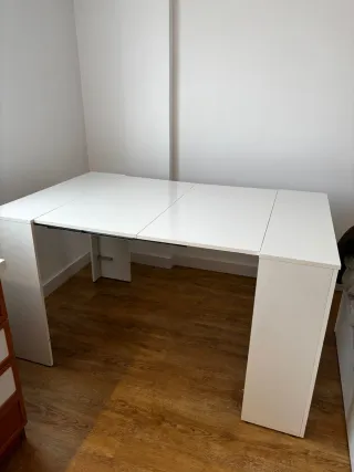 Mesa extensible de diseño moderno y acabado brillante, blanca, cerrada sirve de escritorio, cerrada tiene unas medidas de 51, 5 cm x 90 cm y extendida se le añaden 2 módulos que se apilan en el mismo escritorio, extendida tiene una medida de 1,45 cm x90 cm - Estructura robusta. - Superficie lisa y fácil de limpiar.