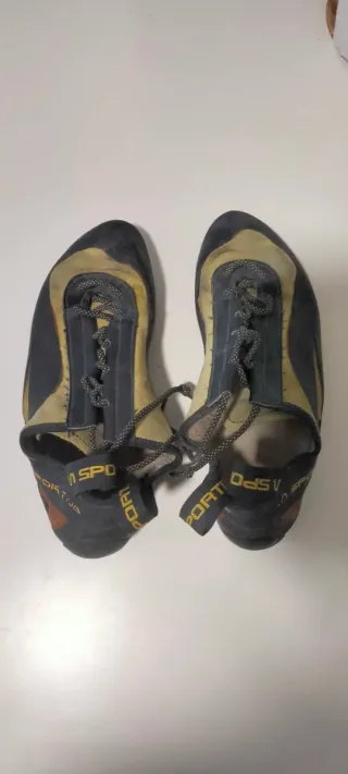 Pies de gato La Sportiva en talla 39. Diseñados para escalada. - Cierre con cordones. - Color azul y amarillo. - Logo de la marca en la tira.