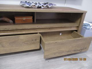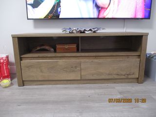 Mueble de televisión de madera. Con 2 cajones. Muy poco uso, intacto. Dimensiones: Largura 130cm. Altura 53cm. Fondo 43cm. Venta en persona.