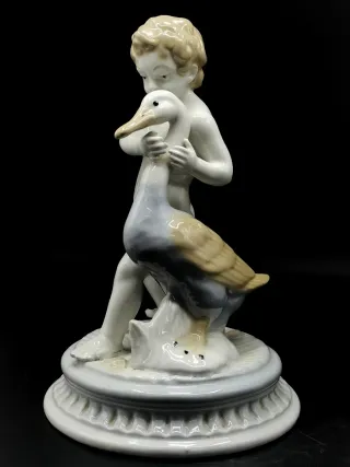 Bonita figura antigua de porcelana que representa a un niño abrazando a un cisne. Una pieza decorativa con encanto. 30 cm. - Material: Porcelana. - Diseño: Niño y cisne.