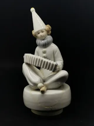 Antigua figura de payaso tocando un acordeón, ideal como caja de música. Funciona correctamente, está reparado como se aprecia en las fotografías. 23 cm.