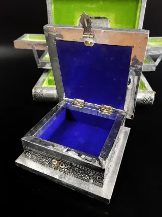 Conjunto de dos joyeros de madera con un elegante acabado plateado, inspirados en el diseño hindú. El interior está forrado con un suave terciopelo. El joyero grande tiene algún defecto en la parte trasera observar última fotografía. 15x15x6 cm. 27x21x8 cm.