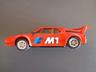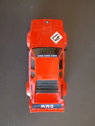 Coche de Scalextric con diseño deportivo. - Color rojo vibrante. - Detalle del número 47 en blanco. - Inscripción 'BMW' en la parte trasera.