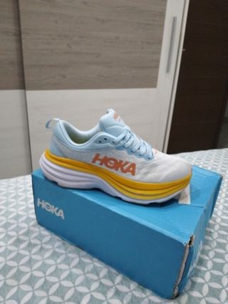 Zapatillas deportivas Hoka en tonos celeste y blanco. - Diseño moderno y cómodo. - Suela con detalles en amarillo.