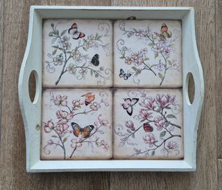 Bandeja decorativa con azulejos que presentan un diseño de flores y mariposas. - Base de madera. - Cuatro azulejos con motivos florales y de mariposas. - Asas laterales para facilitar su transporte.