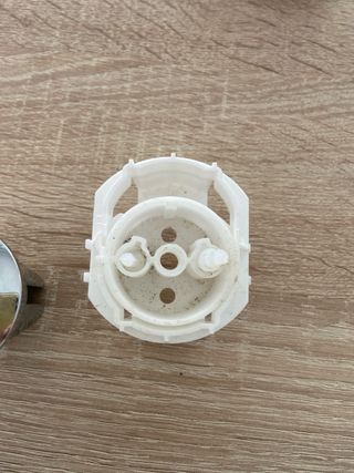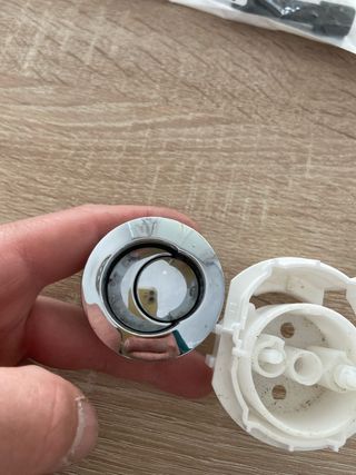 Pieza de repuesto para cisterna de doble descarga Roca. - Acabado plateado brillante. - Mecanismo de plástico blanco.