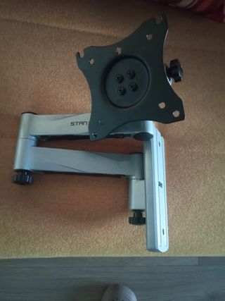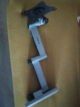 Soporte de pared para TV o monitor pequeño. Fabricado en metal plateado, es robusto y ajustable. - Brazo articulado para diferentes ángulos. - Placa VESA para fijación del monitor. - Base con abrazadera para montaje en pared o escritorio.