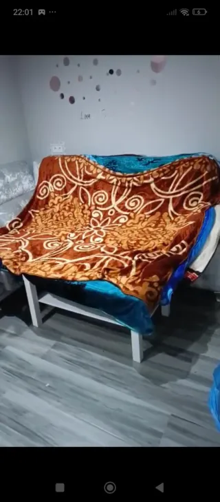Conjunto de mantas de forro polar con un diseño estampado. - Manta principal con estampado floral en tonos marrones y beige. - Manta inferior de color azul intenso.