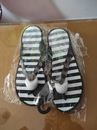 Chanclas de la marca Ruschy, en rayas blancas y negras. Son de la talla 41, unisex. - Están nuevas, en su embalaje original. - Diseño elegante y veraniego. - Perfectas para la playa o piscina. - Diseño de rayas marineras. - Suela cómoda. - Lo que se ve blanco es del embalaje de protección. Puedes ver otras cosas en mi perfil