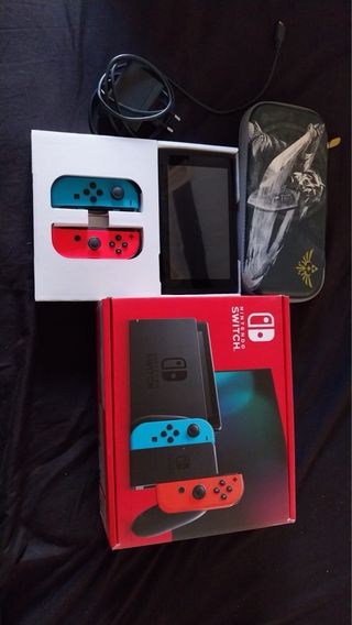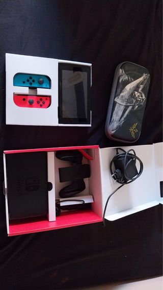 Consola Nintendo Switch con Joy-Cons en azul y rojo. - Incluye Joy-Cons (izquierdo azul, derecho rojo). - Dock para Nintendo Switch. - Adaptador de corriente. - Funda Zelda