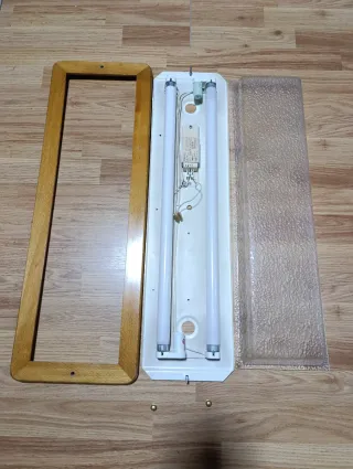 Plafón fluorescente con un diseño elegante y moderno. Medidas 73cm de largo por 24cm de ancho - Marco de madera. - Cubierta de cristal translúcido.