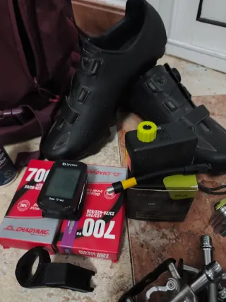 Conjunto de equipamiento para ciclismo en buen estado. - Zapatillas de ciclismo negras. - Ciclocomputador Bryton Rider 15 neo. - Caja de cubiertas Chaoyang 700x23/28C. - Bomba de aire mini compresor BBP120. - Pedales de bicicleta.